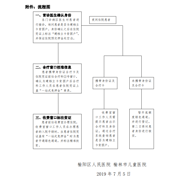 一丶各门诊、病区医生在接诊患者时,实行首诊负责制,在对每位需住院患者办理住院手续、开具住院凭证时,必须仔细询问,确认患者身份(是否为建档立卡贫困户),并在住院凭证上明确标注“建档立卡贫困户”字样,并保证住院凭证预交押金处空白。办理完成后接诊医生需告知患者携带身份证、合疗卡及住院凭证前往合疗科①号窗口对身份进行进一步核实。