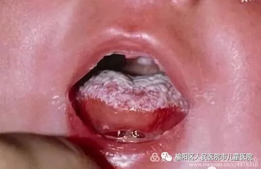 新生儿科中心医师耐心的告诉宝爸,鹅口疮是由白色念珠菌感染所致的口腔黏膜炎症,多见于新生儿和婴幼儿。主要表现为上颚、舌头、颊黏膜等处出现白色乳凝块样物,不容易被擦拭掉,如果强行刮下这些白斑可造成出血。一般患儿无明显不适,如果并发了口炎、咽炎,则会在吸奶时感觉到疼痛,就像这个急诊就诊的小宝宝一样出现哭吵、不愿意吃东西,甚至拒食表现。严重鹅口疮如果蔓延到咽喉,则可能会影响吞咽、呼吸功能,甚至可能会危及生命。